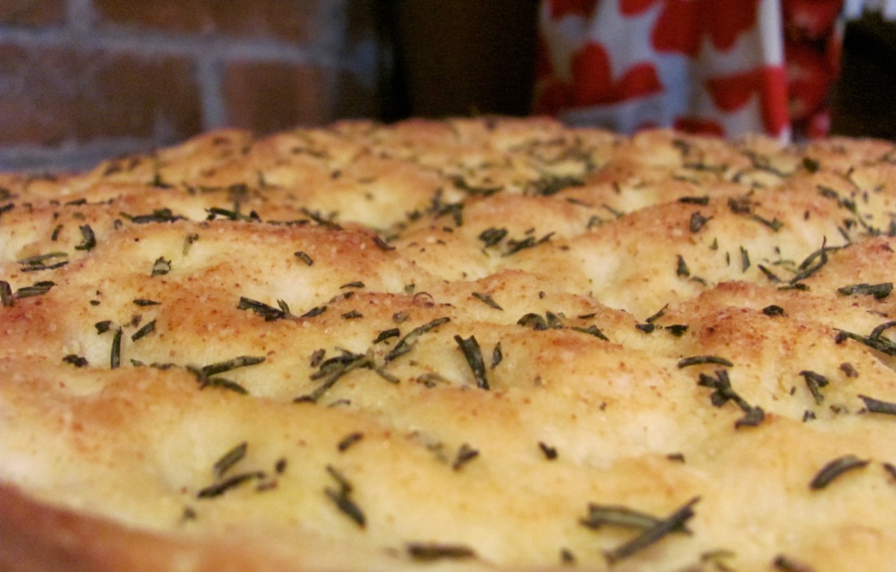Now, I do not claim to be a focaccia expert (though I’ve made it several times). My forefathers and mothers did not make focaccia in their Swedish, Irish and German kitchens (Well, maybe they did. Who am I to say?). But focaccia, my point is, has to be one of the easiest breads to make. And so satisfying. Not to mention amenable to any changes/additions your heart may desire or your pantry/fridge may necessitate (sea salt and olive oil may be all you want, but pancetta and caramelized onions have made their way onto my focaccia and I’ve never regretted their arrival). Have it your way. My way usually involves rosemary, because I have this wild thing taking over our home: