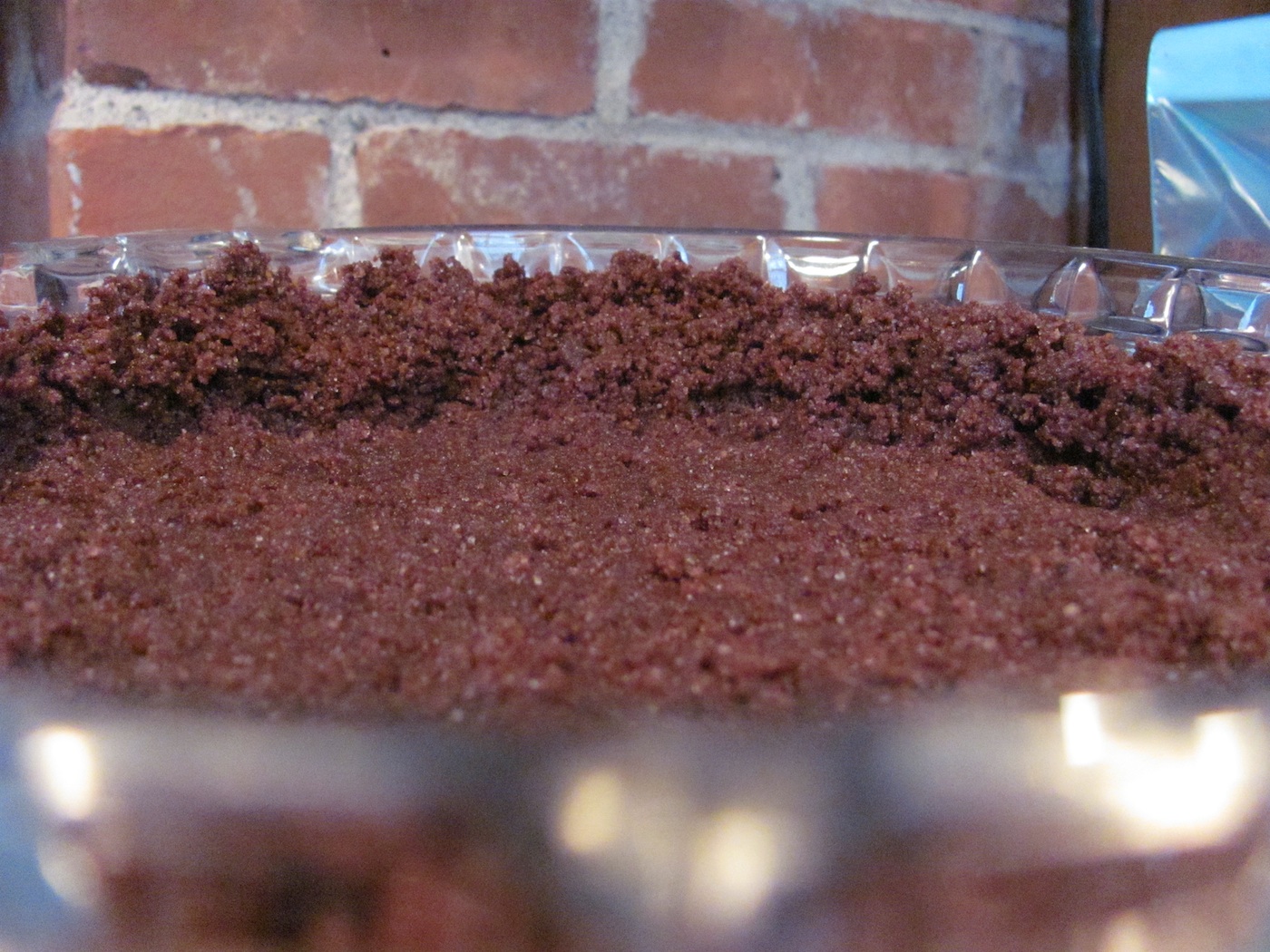 (Adapted from a recipe in Gourmet magazine / February 2004, my version shows off my homemade chocolate wafer cookies, beaten senseless at the altar of pie crust. Keep in mind, though, the cookies are darkly delicious on their own with a tall glass of cold milk [you will have extra wafers].)