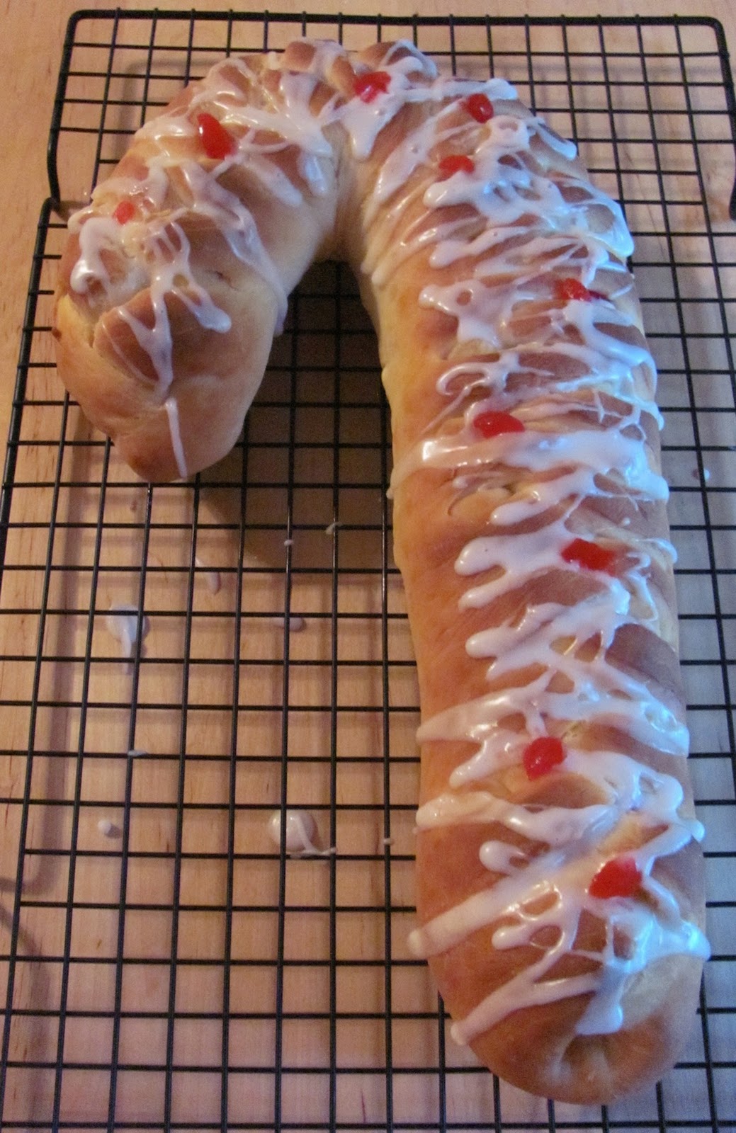 Stretch loaf to 22 inches and twist into candy cane shape.