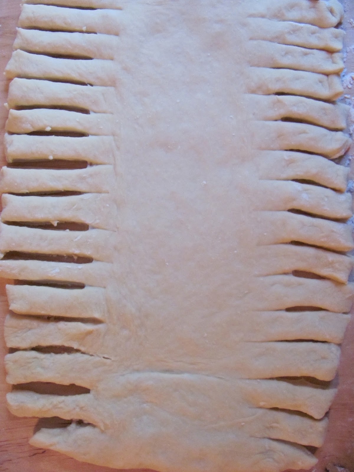 With a sharp knife, make 2-inch cuts at 1/2-inch intervals up each long side of the rectangle.