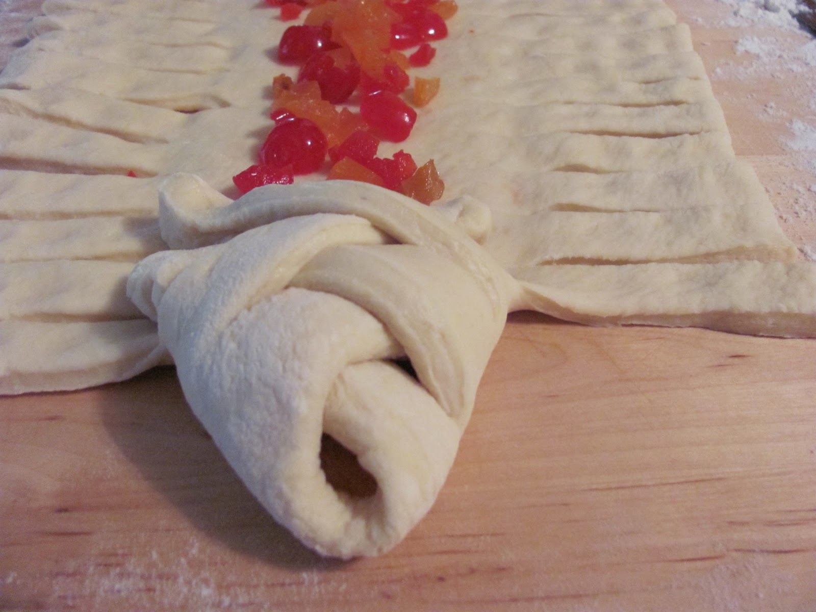 Making Rachel’s Bread, a braided breakfast or coffee bread, is the one tradition I manage to continue from year to year. Rachel taught me how to make it in her mother’s kitchen. She showed me how to fake a braid and turned me on to dried apricots. She also showed me that a little Christmas kitsch with maraschino cherries and white icing is a good thing.