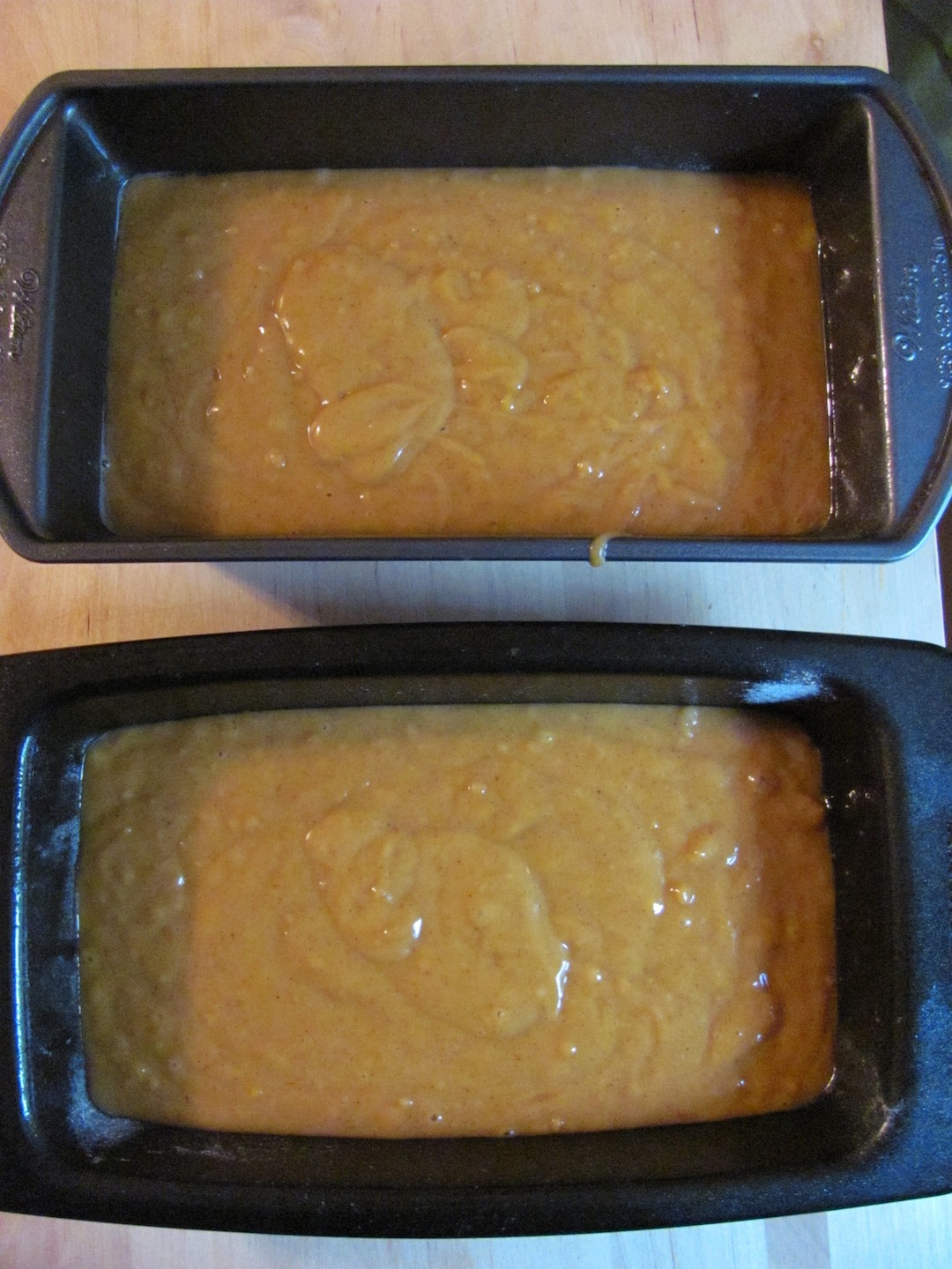 Preheat oven to 350 degrees. Grease and lightly flour two standard-size loaf pans (9×5-ish inches).