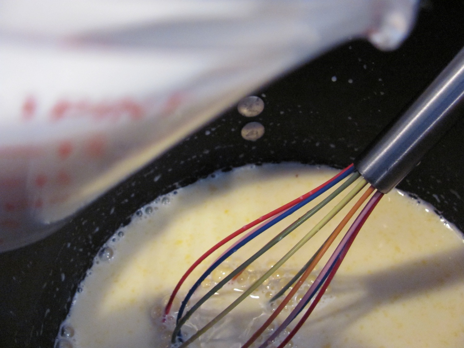 Slowly add milk, whisking continuously while you turn the burner on medium heat.